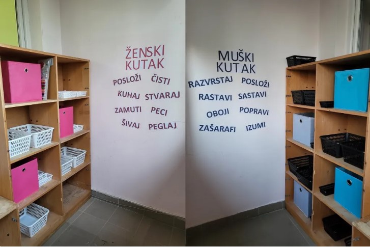 Predmet pritužbi bio je novouređeni školski prostor namijenjen za izvannastavnu aktivnost „domaćinstvo“, podijeljen na „muški“ i „ženski“ kutak. Pretinci za radni materijal također su podijeljeni na plave i ružičaste.