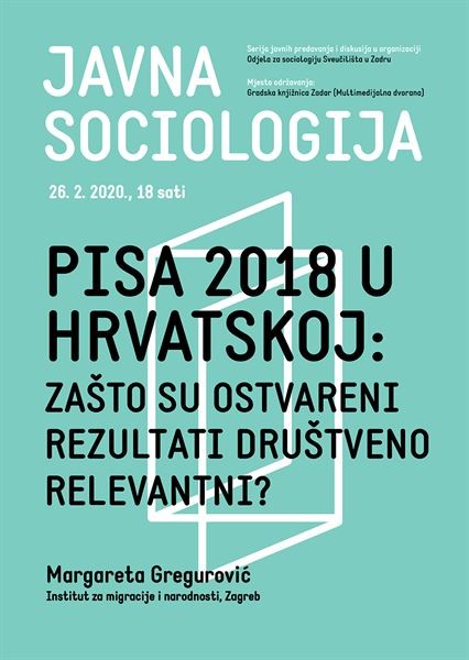 U srijedu, 26. veljače 2020. godine s početkom u 18 sati u Multimedijalnoj dvorani Gradske knjižnice Zadar, dr. sc. Margareta Gregurović s Instituta za migracije i narodnosti iz Zagreba i izvršna urednica časopisa Migracijske i etničke teme održat će javno predavanje pod naslovom “PISA 2018 u Hrvatskoj: zašto su ostvareni rezultati društveno relevantni?”.