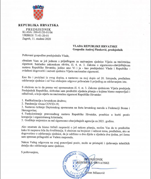 Budući da predsjednik Vlade RH Andrej Plenković još uvijek nije odgovorio na prijedlog Predsjednika Republike za sazivanje sjednice Vijeća za nacionalnu sigurnost od 20. listopada 2020., predsjednik Republike Zoran Milanović uputio je danas ponovo dopis predsjedniku Vlade RH Andreju Plenkoviću u kojemu predlaže sazivanje sjednice Vijeća za nacionalnu sigurnost i predlaže pitanja o kojima bi se raspravljalo i odlučivalo na sjednici VNS-a, a sve sukladno čl. 4. st. 3. Zakona o sigurnosno-obavještajnom sustavu RH.