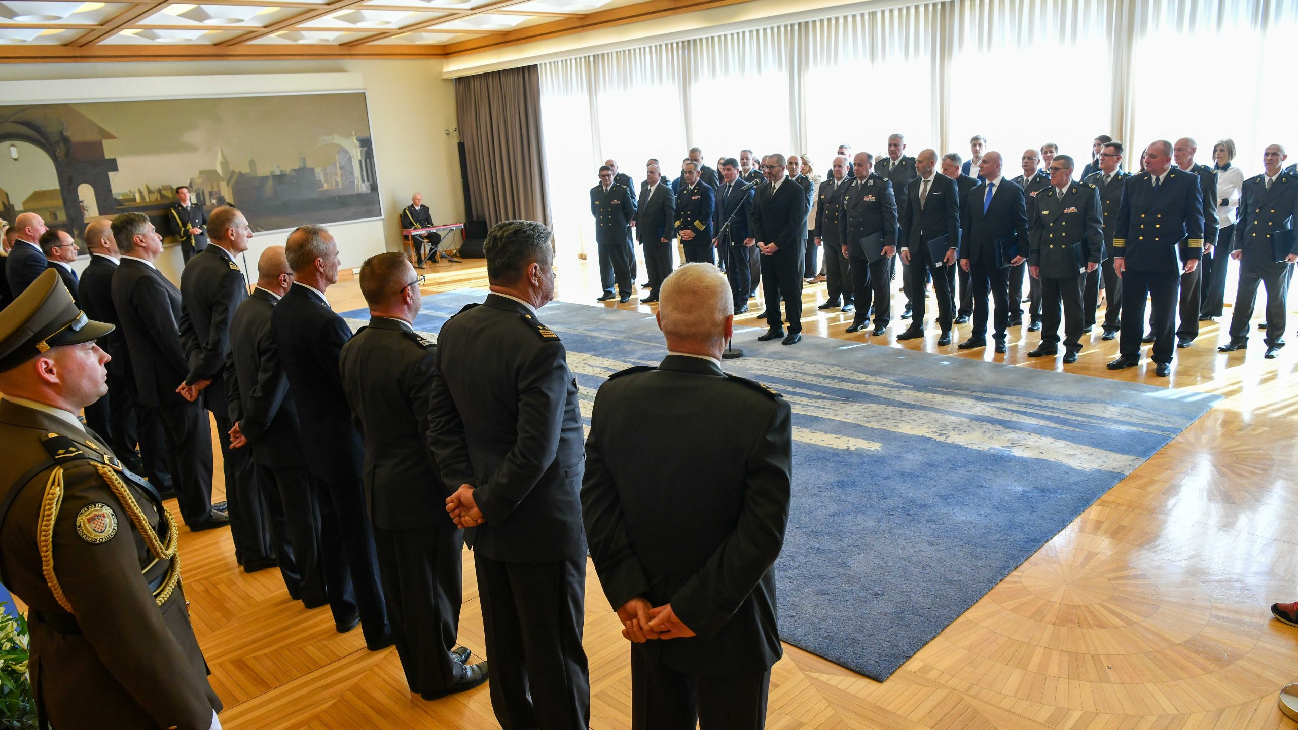 Predsjednik Republike Hrvatske i vrhovni zapovjednik Oružanih snaga Republike Hrvatske uručio je u četvrtak, 6. ožujka 2025. časničke bodeže i odlikovanja umirovljenim visokim časnicima Oružanih snaga Republike Hrvatske na svečanom prijamu u prigodi njihovog umirovljenja.