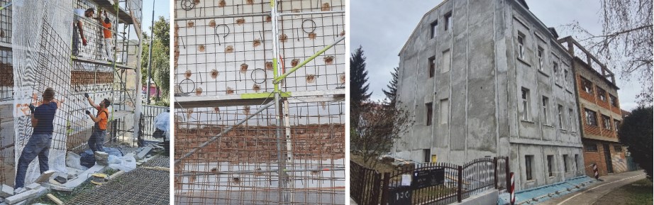 Već u ljeto 2020. godine započelo se s radovima na obnovi zgrade. Svi radovi su izvođeni u skladu s projektom obnove građevinske konstrukcije uz provođenje projektantskog i stručnog nadzora nad radovima. Prilikom izvođenja radova dolazilo se do veoma delikatnih izvođačkih detalja, naročito prilikom skidanja starih dijelova žbuke jer je u pojedinim dijelovima fasadnih zidova dolazilo i do mogućeg urušavanja zida zbog dotrajalosti opeke stare više od 100 godina. Treba napomenuti da su ovo radovi koji zahtijevaju vrlo osposobljene izvođače, što se u ovom slučaju i postiglo, naročito zahvaljujući dobroj suradnji izvođača radova i nadzornog osoblja. Zbog neravnina i nepravilnosti fasadnih zidova, umjesto predviđenih 6 cm torkreta, na pojedinim dijelovima fasada debljina torkreta dosezala je i 10-12 cm, pa se torkret izvodio strojnim nabacivanjem u tri sloja. Tijekom izvođenja provedena je povremena kontrola kvalitete betona za betoniranje temelja i izvedbu torkreta i gotovog tvornički spravljenog torkreta za ojačanje vanjskih zidova. Na fotografijama prikazani su pojedini detalji izvođenja. Vidljivo je da se kod nekih tehničkih rješenja u ostvarivanju potresne otpornosti koristio čelik zbog svojih brojnih prednosti. Uz zajedničku koordinaciju svih sudionika u gradnji, od investitora, projektanta do izvođača, svi zahvati su uspješno privedeni kraju tijekom zime 2020. godine.