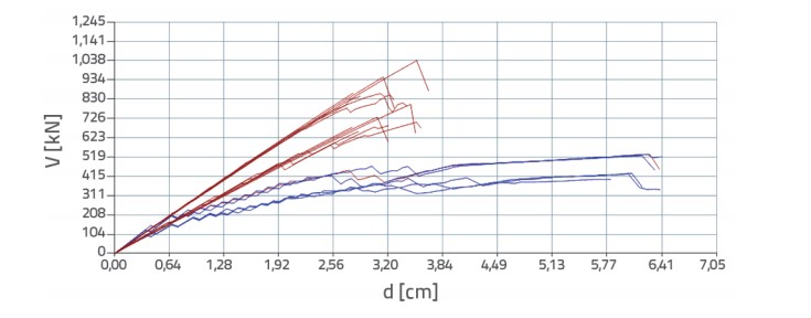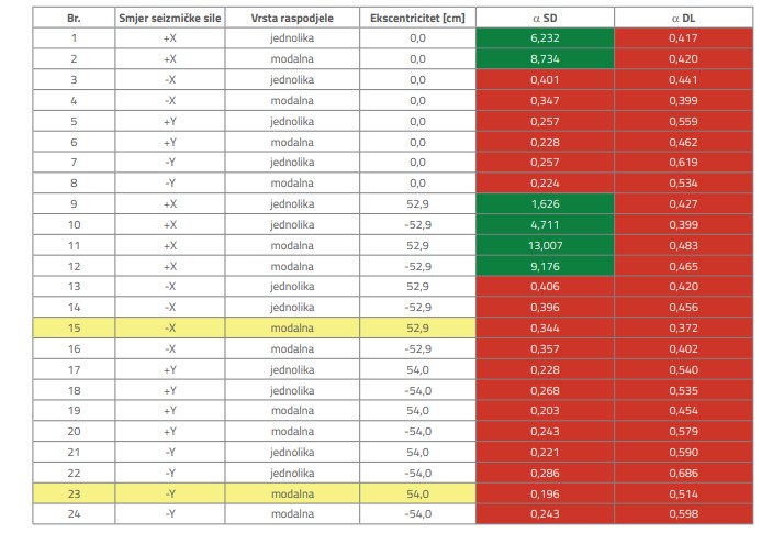 Proračun se provodi na ekvivalentnom sustavu s jednim stupnjem slobode (ESDOF) sa sljedećim proračunskim parametrima: period titranja ekvivalentnog sustava T* = 0,764 s, faktor pretvorbe Γ = 1,25, sila pri popuštanju ekvivalentnog sustava (granična čvrstoća) Fy * = 542 kN, pomak pri popuštanju ekvivalentnog sustava dy * = 2,2 cm i maksimalni pomak ekvivalentnog sustava dm* = 2,23 cm. Nakon provedenog proračuna, program tablično prikazuje faktore ispunjenja za svaku analizu i za oba granična stanja. U slučaju vrijednosti faktora ispunjenja koja je veća od 1, smatra se da je uvjet nosivosti zadovoljen i da konstrukcija posjeduje zadovoljavajuću sposobnost za preuzimanje seizmičkih sila, odnosno da su pomaci konstrukcije manji od graničnih pomaka za odgovarajuće granično stanje definiranih normom. Žutom bojom označene su dvije mjerodavne analize, po jedna za svaki smjer, zelena boja označava analizu koja je zadovoljila uvjete, a crvena boja označava analizu koja nije zadovoljila uvjete proračuna. Prikazom svih krivulja kapaciteta na zajedničkom dijagramu očito je da konstrukcija u smjeru X ima veću deformacijsku sposobnost od one u smjeru Y (do 2 puta). Razlog tome je što u smjeru Y prevladavaju posmični zidovi s manjim otvorima, a u smjeru X prevladavaju veliki i brojniji otvori uslijed kojih se takvi zidovi više ponašaju kao okviri i primarno nose na savijanje. Granična nosivost na poprečnu silu za smjer X iznosi 534 kN, a za smjer Y 1038 kN. S obzirom na to da je u metodi postupnoga guranja deformacijska sposobnost konstrukcije važnija od granične nosivosti, može se zaključiti da konstrukcija ima veću otpornost u smjeru X. To se uočava u tablici, gdje su vrijednosti faktora ispunjenja veće u analizama u kojima je seizmička sila zadana u smjeru X u odnosu na analize u smjeru Y. Najmanja vrijednost faktora ispunjenja je ona iz analize broj 23 i iznosi 0,196, što bi značilo da konstrukcija ima sposobnost izdržati 19,6 posto projektiranog vršnog ubrzanja tla za povratni period od 475 godina. Na slici je prikatan zajednički dijagram svih krivulja kapaciteta, na kojem os x označava pomak konstrukcije, a os y prikazuje poprečnu silu u tlocrtu. Kao izdvojeni zid promatra se zid zapadnog pročelja u sklopu mjerodavne analize za smjer X.