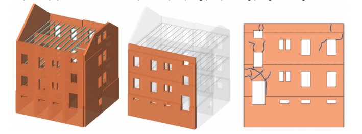 Zgrada je modelirana već opisanim postupkom u kojem se zidovi modeliraju kao makro-elementi i za potrebe proračuna zamjenjuju se ekvivalentnim okvirima. S obzirom na to da etaža suterena nije značajno ukopana u tlo, osim na dvorišnoj strani zgrade, odlučeno je da će se i ona modelirati i uključiti u procjenu seizmičke otpornosti.