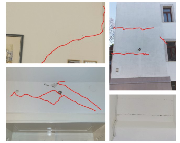 Glavnina oštećenja odnosi se na vertikalne, horizontalne i dijagonalne pukotine na vanjskim stranama zidova sjevernog i istočnog pročelja, većinom u prizemlju i na prvom katu, te na značajnije pukotine u nadvojima središnjeg nosivog zida. Osim toga, oštećeno je i stubište gdje se uočavaju pukotine u podgledu stubišnih krakova te mrežaste pukotine na središnjem stubišnom zidu. U etaži suterena nisu uočena konstrukcijska oštećenja. Pregledom konstrukcije drvenog krovišta nisu utvrđena nikakva oštećenja te se njezina mehanička otpornost i stabilnost ocjenjuje zadovoljavajućom. Sastavni dio elaborata je i preliminarna analiza potresne otpornosti zgrade na osnovi koje se ocijenilo u kojoj mjeri zgrada ispunjava zahtjeve sadašnjih propisa i normi te je li prikladna za obnovu i pojačanja konstrukcije. Nakon provedenih preliminarnih proračuna zaključilo se da, iako zgrada posjeduje određen postotak zidova u oba smjera koji bi se mogao smatrati zadovoljavajućim u određenim uvjetima, zgrada ima velike nedostatke vezane za seizmičku otpornost. Glavni nedostatak je taj što se u glavnim nosivim zidovima, tj. zidovima na koje se oslanjaju čelični nosači i drveni grednici međukatnih konstrukcije, nalazi velik broj otvora što značajno smanjuje krutost i otpornost tih zidova. Od ostalih bitnih nedostataka treba spomenuti međukatne konstrukcije izgrađene od drvenih grednika, koje nemaju dovoljnu krutost u svojoj ravnini da bi se mogle promatrati kao krute dijafragme, što je jedan od bitnih zahtjeva kod seizmičkog proračuna čime se ujednačavaju pomaci svih točaka konstrukcije i ostvaruje pravilnija preraspodjela sila u nosivim elementima. Nedostatak je i nedovoljna povezanost drvenih grednika s nosivim zidovima, te zabatni zidovi koji su nepridržani cijelom visinom jer se na njih ne oslanjanu međukatne konstrukcije. S obzirom na sve navedeno, zaključeno je da je zgrada pogodna za obnovu, a s obzirom na svoju namjenu, odabrana razina obnove 3 – pojačanje konstrukcije. U sklopu elaborata, a u skladu s odabranom razinom obnove, predloženi su zahvati na popravku i pojačanju konstrukcije.
