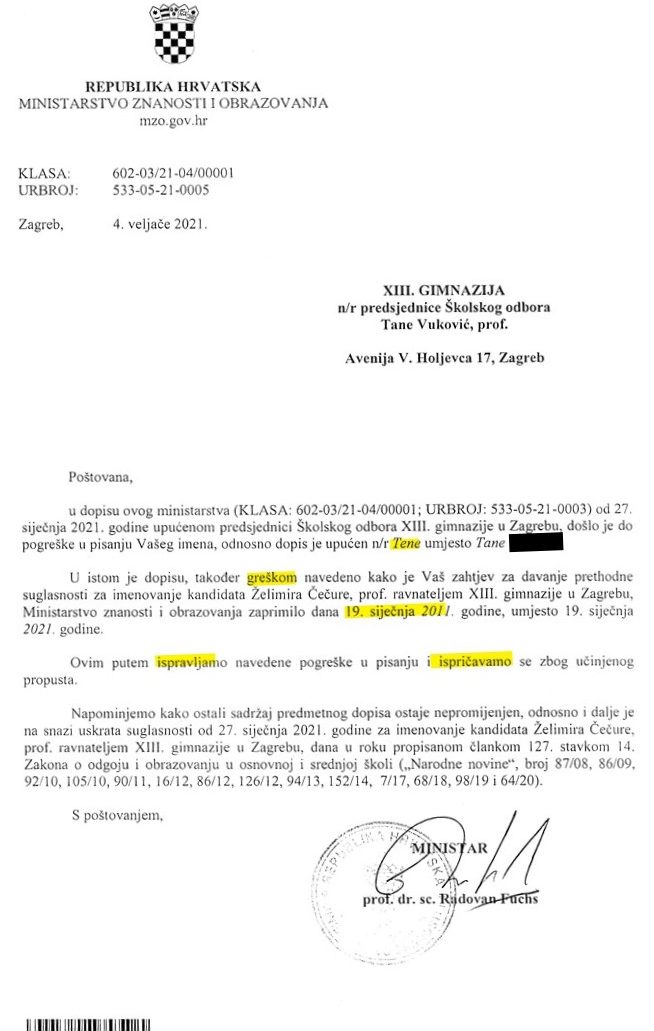 Ministarstvo znanosti i obrazovanja 2021. godine uskratilo je suglasnost na odluku Školskog odbora o imenovanju ravnatelja. Prva suglasnost bila je nepismena, s ozbiljnim pogreškama i sadržajno nevjerodostojna. Druga je bila „ispravak” prve, ali također s greškama (u prilogu teksta) koje ukazuju da su u MZO-u neodgovorni, nepismeni i da ne gledaju ništa osim podobnosti. Takvi dokumenti, koji bi trebali predstavljati ozbiljnost i autoritet države, u praksi su odlučili o sudbini škole i čovjeka.