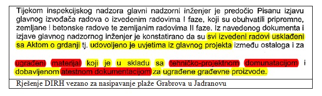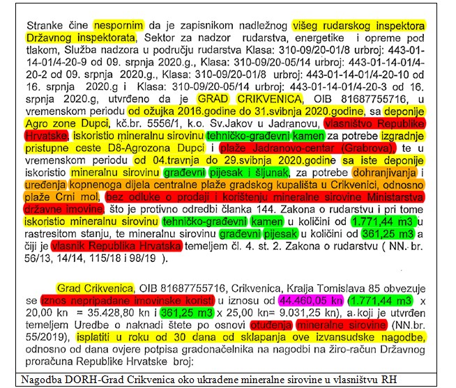 Daljnjim inspekcijskim nadzorom DIRH slučaja dohranjivanja Gradske plaže u Crikvenici iz 2020. godine doznali smo da je materijal za dohranjivanje Grad Crikvenica ukrao od Republike Hrvatske. Slučaj je završio na DORH, a Grad Crikvenica odnosno gradonačelnik kao odgovorna osoba se je nagodio s DORH i morao je Grad Crikvenica platiti za ukradenih 2.200 m3 preko 44.000 kuna. Ukradeni materijal koristio se je ne samo za dohranjivanje plaže u Crikvenici nego i za nasipavanje plaže Grabrova u Jadranovu i izgradnju ceste u agrozoni.