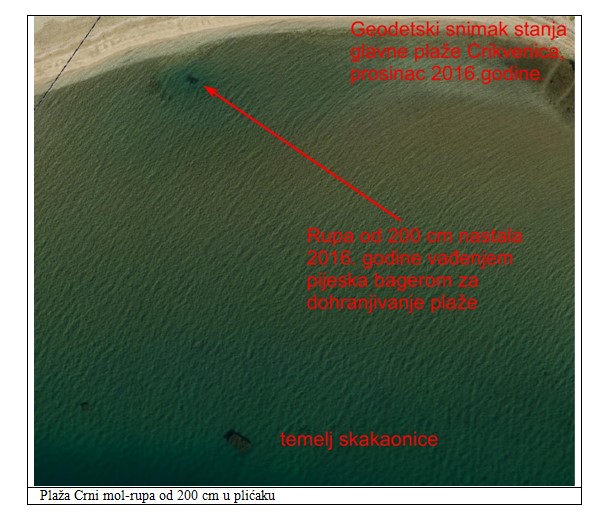 Zanimljiv je slučaj vađenja pijeska bagerima iz plićaka plaže Crni mol, koji se kasnije koristi za dohranjivanje plaže. Najdrastičniji slučaj dogodio se je 2016. godine kada je u plićaku plaže Crni mol zbog vađenja pijeska nastala rupa od 200 cm. Čisto sumnjam da Grad Crikvenica ili tadašnji koncesionar imaju koncesiju za vađenje pijeska iz plićaka.