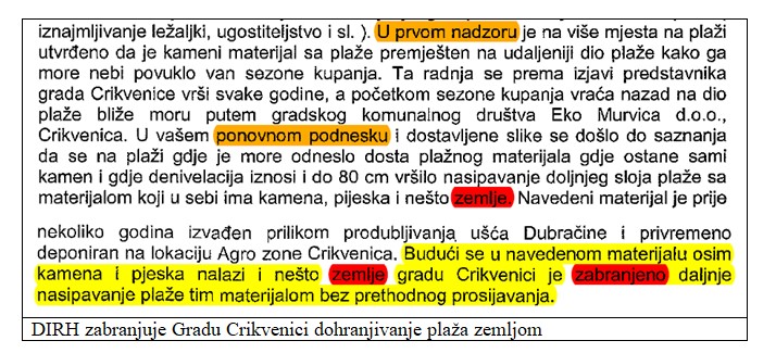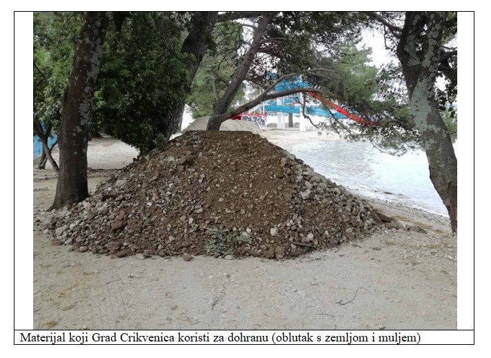 Zanimljivo je podsjetiti se i slučaja dohranjivanja Gradske plaže u Crikvenici iz 2020. godine, kada je Grad Crikvenica dohranjivao plažu oblutcima s dosta zemlje i mulja. Nakon prijave slučaja DIRH došlo je do zabrane dohranjivanja plaža s oblutcima s zemljom. Taj isti zabranjeni oblutak s zemljom i muljem jedan od visoko pozicioniranih „stručnjaka“ Grada Crikvenice komentirao je kao da je to „Najčišći oblutak na ovom svijetu”.