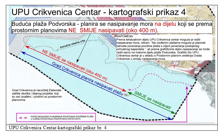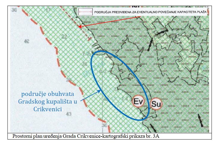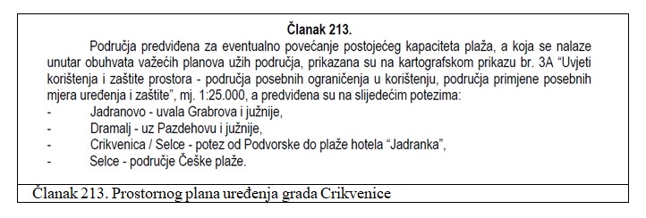 Dakle, niti Gradska plaža u Crikvenici u cijelosti niti djelomično plaža Podvorska uz šetalište Vladimira Nazora nisu predviđeni člankom 213. Prostornog plana uređenje grada Crikvenice kao područja na kojima se predviđa eventualno povećanje postojećeg kapaciteta plaža.