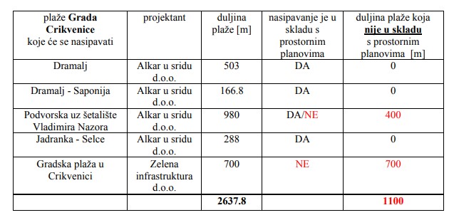 Iako je za četiri od pet plaža Grad Crikvenica napravio Elaborat zaštite okoliša, odnosno proveo je postupak ocjene o potrebi procjene utjecaja zahvata na okoliš (OPUO), to ne garantira da će se postupak nasipavanja projektiranih plaža provesti sukladno pravilima struke i zakonskim normama. Zašto bi netko (Grad Crikvenica) tko je radio nasipavanje plaže Grabrova u Jadranovu preko noći promijenio način izgradnje plaža.