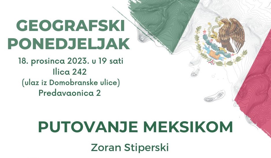Predavanje dr. Zorana Stiperskog u sklopu javne tribine Geografski ponedjeljak Hrvatskoga geografskog društva sa studijskog putovanja po Meksiku održati će se u ponedjeljak, 18. prosinca 2023., s početkom u 19 sati u prostorijama Geografskog odsjeka PMF-a u Zagrebu na privremenoj adresi u Domobranskoj ulici (prostori Hrvatskoga katoličkog sveučilišta). Na predavanju će biti dat naglasak na gradovima i arheološkim nalazištimakako bi sagledali bogatstvo različitih civilizacija koje su živjele na ovim prostorima.Predavanje je otvoreno za sve i besplatno je.