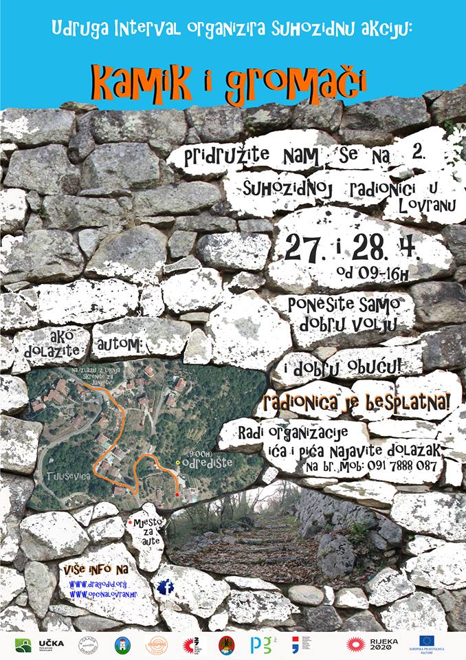 Ukoliko ne znate kako provesti postuskršnji vikend, udruga Interval iz Lovrana poziva sve ljubitelje kulturne baštine i sve zainteresirane ljude dobre volje da im se priključe u obnovi suhozida i pritom nauče više o mediteranskoj vještini zidanja “u suho”.