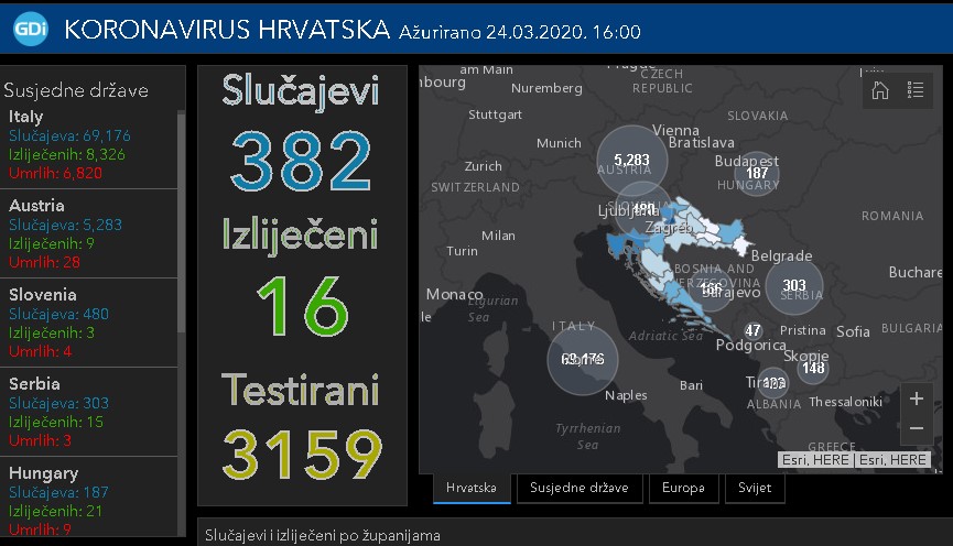 Osim broja zaraženih koronom u Hrvatskoj i drugim državama, softwer GDi omogućuje obradu podataka s brojem bolesnih i izoliranih prema mjestima prebivališta.