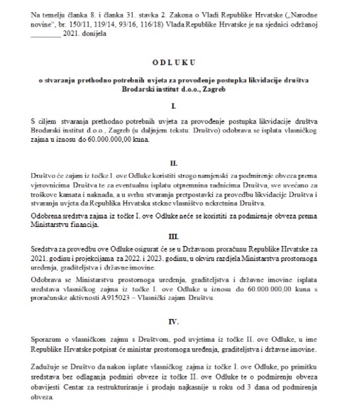 Kao što ste možda već doznali iz medija, Vlada RH je na sjednici (4. studenog 2021.) donijela Odluku o stvaranju prethodno potrebnih uvjeta za provođenje postupka likvidacije društva Brodarski institut d.o.o. Zagreb (BI). Pri tome se iz rebalansa proračuna s ciljem stvaranja prethodno potrebnih uvjeta za provođenje postupka likvidacije društva Brodarski institut d.o.o., Zagreb odobrava isplata vlasničkog zajma u iznosu do 60.000.000,00 kuna.