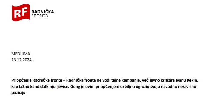 Gong širenjem poluinformacija staje otvoreno na stranu jedne kandidatkinje i pokušava blatiti Radničku frontu. Ako je netko napao „integritet” hrvatskih predsjedničkih izbora to sigurno nije Radnička fronta, već oni koji svoju poziciju navodno „neovisnog” promatrača koriste da bi radili kampanju za jednu kandidatkinju. Time se ugrožava uloga institucije Gonga kao potrebne i nezavisne udruge civilnog društva čija je uloga poticanja demokratskih procesa ovime priopćenjem znatno narušena. https://gong.hr/2024/12/13/gong-pozvao-dip-istrazite-tko-stoji-iza-dezinformacijske-kampanje-protiv-iva ne-kekin