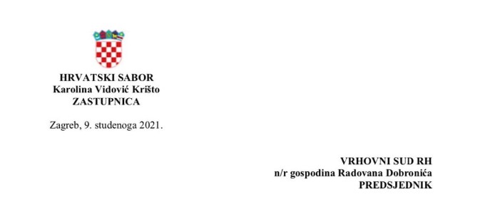 Čini se da će novi predsjednik Vrhovnog suda, Radovan Dobronić dobiti priliku da, kako on kaže, malo “pročačka”, postupanja i zakonitost rada nižeg suda, konkretno Općinskog suda u Rijeci i suca toga suda, izvjesnog Zlatka Kojundžića. Naime, sve navedeno proizlazi iz otvorenog pisma saborske zastupnice Karoline Vidović Krišto, koja osim zavidne razine političke aktivnosti u Saboru posjeduje i nesvakidašnju dozu građanske hrabrosti. Cjelovito pismo KVK, upućeno u utorak, 9. studenog 2021. na adresu predsjednika Vrhovnog suda Republike Hrvatske, donosimo u nastavku teksta, i to kako slijedi: