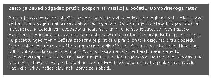 Moja uključenost u zbivanja u Hrvatskoj započela je ranih devedesetih, u vrijeme kada je Domovinski rat išao vrlo loše. I dalje sam u to vrijeme bio savjetnik Margaret Thatcher iako smo oboje već napustili Downing street 10. Oboje smo bili osupnuti cinizmom i slabošću Zapada na toj prekretnici. I oboje nas je taj dio svijeta – koji ja dotad nisam posjetio, iako gospođa Thatcher jest u vrijeme Tita – počeo pobliže zanimati.