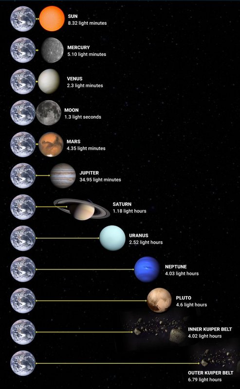 Slika 1 – Sunčev sustav izražen svjetlosnim minutama jednosmjerno u odnosu na Zemlju