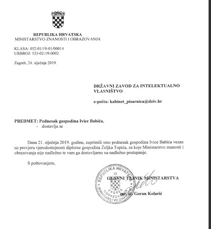 Prema pisanju pojedinih domaćih i inozemnih medija, osoba u Republici Hrvatskoj sumnjičena u više navrata za posjedovanje lažne diplome i dalje vrlo aktivno sudjeluje u radu na temu intelektualnog vlasništva u međunaronim razmjerima. Riječ je o Željku Topiću, nekadašnjem ravnatelju Državnog zavoda za intelektualno vlasništvo RH (DZIV) i potpredsjedniku Europske patentne organizacije (EPO), sada samostalnom zastupniku za patente i žigove u RH koji se reklamira pod zanimljivim sloganom „TOPIĆ IP – Štit za vašu rafiniranu imovinu“ što je vidljivo sa slijedeće internetske stranice: www.topicip.com/.