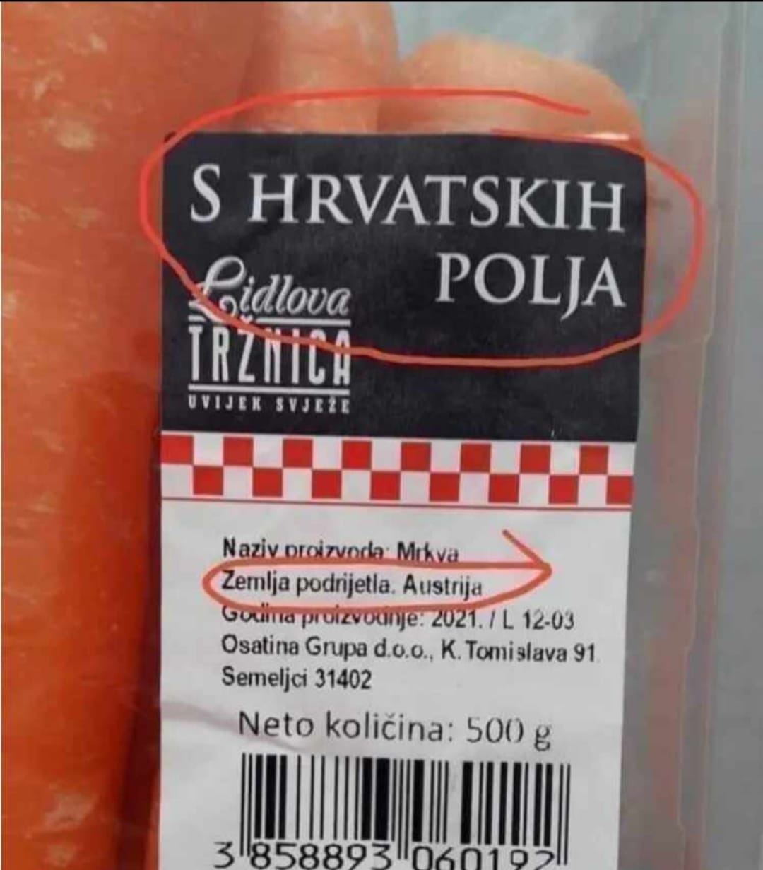 Naime, u državi koju napušta sve veći broj hrvatskih ljudi, iako su svim političkim strankama puna usta brige o građanima, i dalje vlada neuobičajeni poslovni i porezni šlamperaj. Naime u prilogu teksta donosimo fotografiju jednog čitatelja portala Panopticum čija snimka kupljenog proizvoda iz trgovačkog lanca Lidl govori više od tisuću riječi. Naime, iz priloženog je sasvim razvidno kako strani trgovački lanac smatra hrvatske građane više nego maloumnima nudivši im poljoprivredni proizvod pod nazivom “S HRVATSKIH POLJA” na svojim policama trgovina širom zemlje dok na istom proizvodu stoji na deklaraciji otisnuta Austrija kao zemlja porijekla. Obzirom na ovaj primjer, državnim institucijama bi se s razlogom moglo uputiti pitanje jesu li nadležni svjesni da hrvatski građani kupuju sumnjive proizvode upitne kvalitete s mogućnošću ozbiljnih zdravstvenih tegoba.