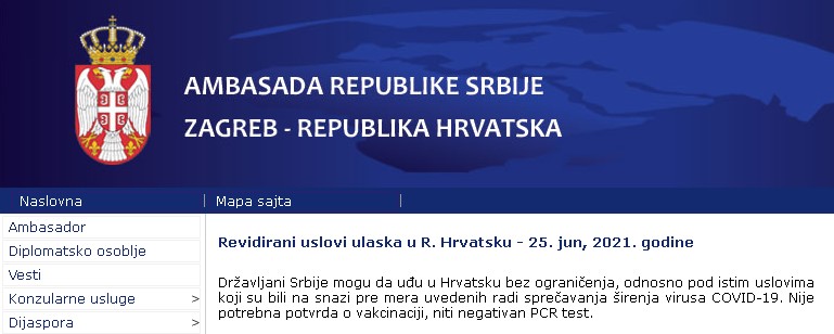 U trenucima dok hrvatski premijer Plenković u Bruxellesu moljaka čelnike EU za ulazak hrvatske u Schengen, dakle u zonu bez granica, srbijansko veleposlanstvo u Republici Hrvatskoj istoga dana, u petak, 25. lipnja 2021. godine, na svojim službenim internetskim stranicama objavljuje revidirane uvjete ulaska u Hrvatsku iz kojih je razvidno da državljani Srbije sada mogu granicu RH prelaziti bez ograničenja. Naime, za državljane Srbije od navedenog datuma nije potrebna potvrda o cijepljenju, niti negativan PCR test – navodi se u obavijesti veleposlanstva Republike Srbije sa sjedištem u Zagrebu.
