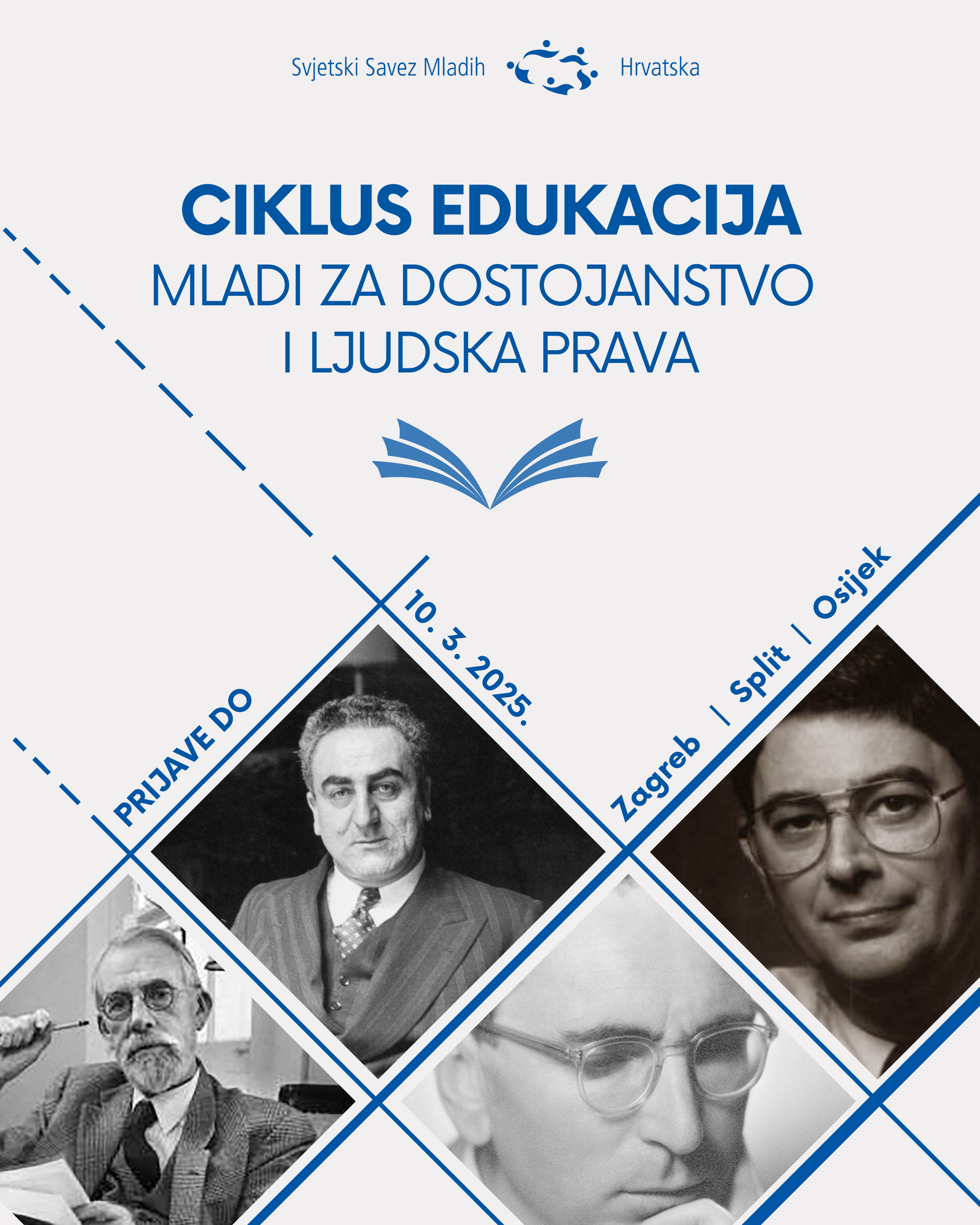 Svjetski savez mladih Hrvatska (SSMH) poziva sve mlade u dobi od 18 do 30 godina na sudjelovanje u edukacijskom ciklusu “Mladi za dostojanstvo i ljudska prava”, koji se već dugi niz godina provodi s ciljem poticanja aktivnog promišljanja o temeljnim društvenim pitanjima te moralnim i ljudskim vrijednostima.