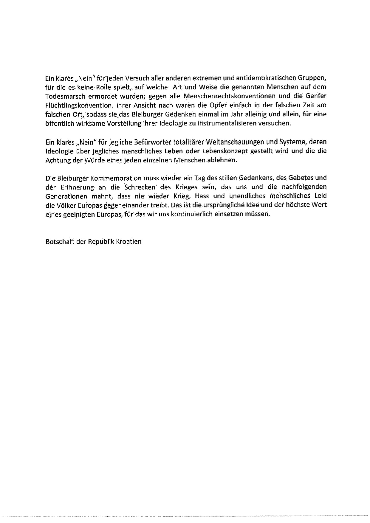 U tom je kontekstu još jednom potrebno jasno naglasiti kako Veleposlanstvo Republike Hrvatske u Austriji najoštrije osuđuje svako nastojanje protuustavnih i antidemokratskih grupacija, odnosno pojedinih osoba, koji iz bilo kojeg razloga pokušavaju prisvajati komemoraciju u Bleiburgu za propagiranje svojeg ekstremističkog svjetonazora odnosno jedne propale i okorjele ideologije.
