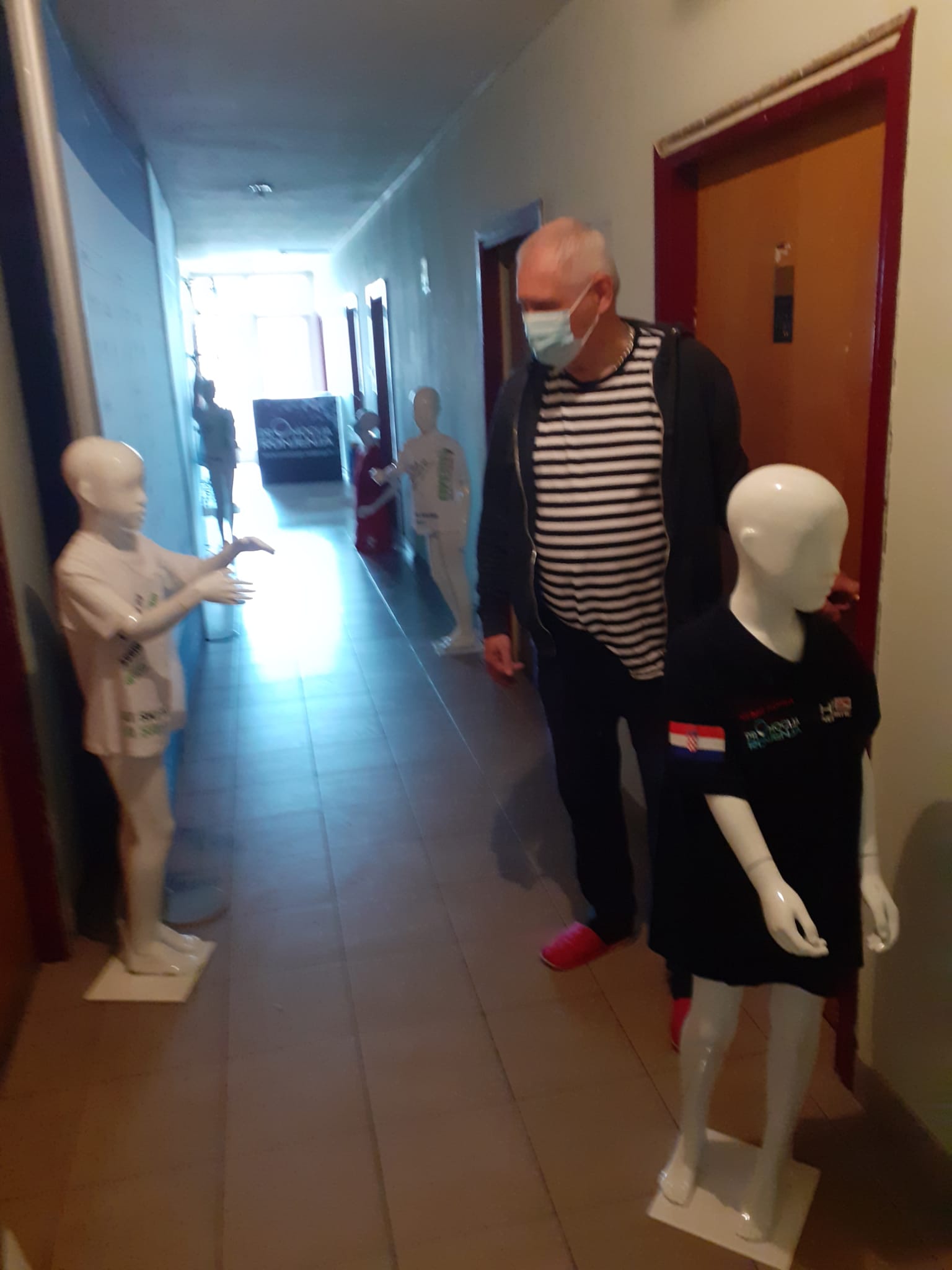 U mobilizirani Hostel Arena na rubu zaljuljanog grada (koji se sastoji od 5 katova i zajedničkih prostorija od kojih 5. kat već godinama nije u funkciji, a 4. kat nije uglavnom bio u funkciji te se sporadično osposobljavao kako su stanari stradalnici naseljeni često po 2 ili čak 3 osobe u sobu 18m2, doduše pristojne niže kategorije, sa kvalitetnom prehranom u menzi) dakle stradalnici su bili isprva smješteni u prva tri kata, uz nekolicinu ranijih privatnih najmoprimaca soba (bez prehrane) koji su za to plaćali komercijalnu cijenu od 1.200 kn mjesečno, par soba za dnevni i noćni odmor vjerojatno djelatnicima Gradske uprave, bilo je i par soba za Crveni križ dok je bio, na hodniku 4. kata koji je očito služio kao zbrda-zdola skladište, nalazile su se neke plastične lutke za izloge, glavni problem 4. i još uvijek zatvorenog 5. kata čini se da su devastirane sanitarije.
