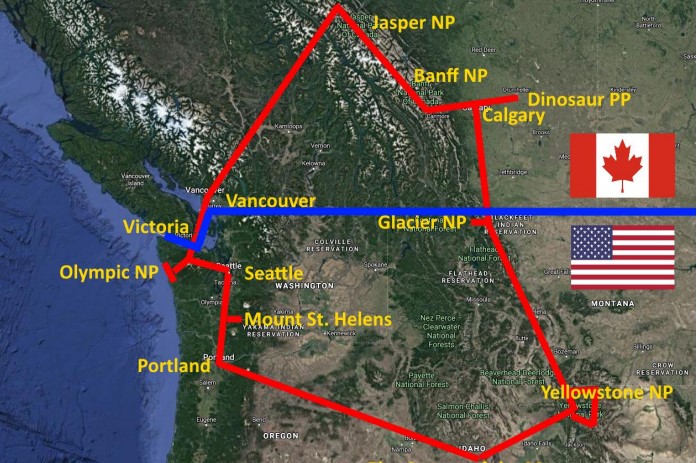 Studijsko putovanje u organizaciji Odsjeka geografije zagrebačkog PMF-a po SAD i Kanadi odrzat ce se od 15. srpnja do 2. kolovoza 2020. godine. Putovanje po SAD i Kanadi započinje i završava u Seattlu, SAD. Nema unutrašnjih letova. Ukupno će se u 17 dana putovanja kroz dvije sjevernoameričke države cestom prijeći oko 4.800 km.