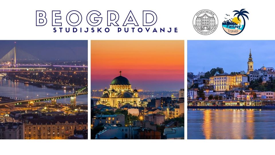 Članovi Studentskog zbora Pravnog fakulteta u Zagrebu organiziraju studijsko putovanje u Beograd od 21. do 23. veljače 2020. godine. Prijave su moguće do 1. veljače 2020. po cijeni 590 kn po osobi. Program putovanja donosimo u nastavku a cijena trodnevnog aranžmana uključuje: turističkog vodiča, prijevoz turističkim autobusom, dva noćenja s doručkom u hotelu 3* u Beograd, smještaj u dvokrevetnim/trokrevetnim sobama, razgled grada prema program, osiguranje, troškove organizacije i realizaciju putovanja. Cijena aranžmana ne uključuje: ulaznice za pojedine objekte koje se dodatno plaćaju, boravišna pristojba u hotelima u Beogradu (cca 1-2 eura po osobi i danu).