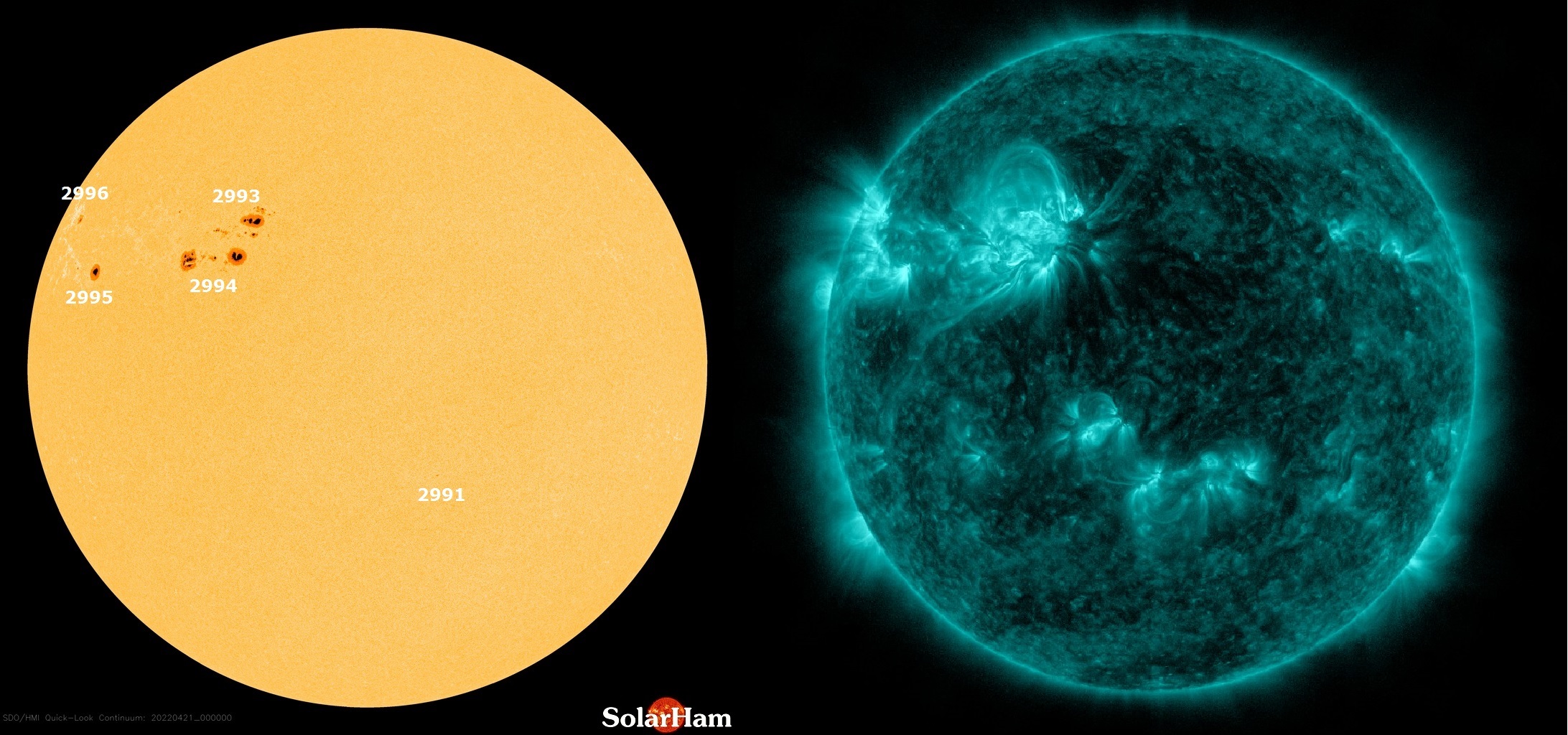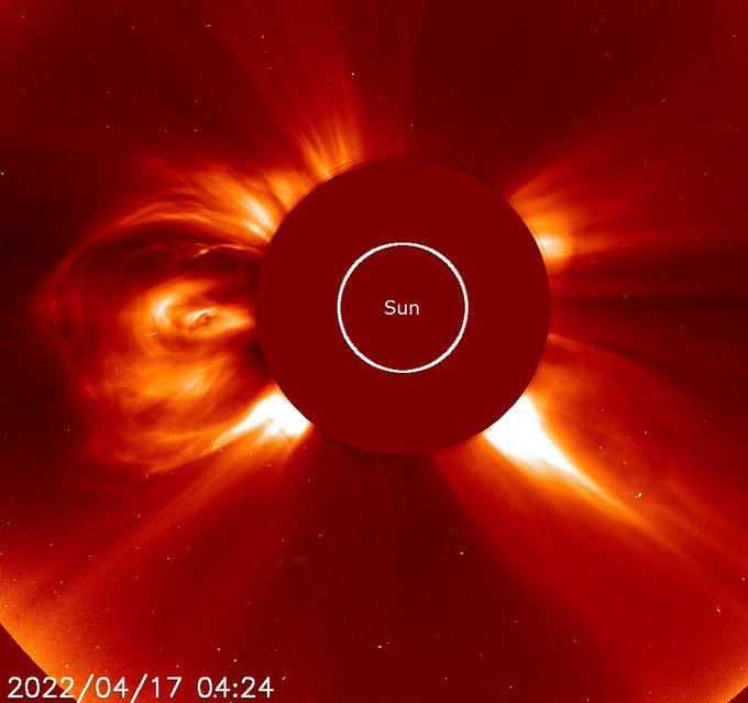 Ali, mi Zemljani imamo i novije probleme. Velika solarna baklja magnitude X1.1 je otkrivena u nedjelju 17.4.2022. oko vrlo aktivne sunčeve pjege AR 2994., te još jedna Magnitude X2.2 od sunčeve pjege AR 2992, koja se zbog sunčeve rotacije okrenula od smjera Zemlje. Te baklje su izazvale jako zamračenje kratkovalnog radija i pomorske telekomunikacije u jugoistočnoj Aziji i dijelu Australije, jer je solarna baklja utjecala na tada osunčanu stranu Zemlje.