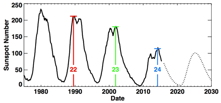 Trenutno se nalazimo u takozvanom 25. Solarnom ciklusu. Otprilike svakih 11 godina, Sunčevo magnetsko polje napravi preokret. Drugim riječima, sjeverni magnetski pol postaje južni magnetski pol, i obrnuto. Kako ciklus napreduje, stvara se sve više Sunčevih pjega koje su vidljiva manifestacija magnetskih oluja. Broj sunčevih pjega s vremenom raste do nekog maksimuma i tada se magnetsko polje preokreće. Zatim se aktivnost Sunca počinje smanjivati do minimuma kada na njegovoj površini mjesecima nema gotovo niti jedne pjege. Od tog minimuma započinje novi sunčev ciklus.
