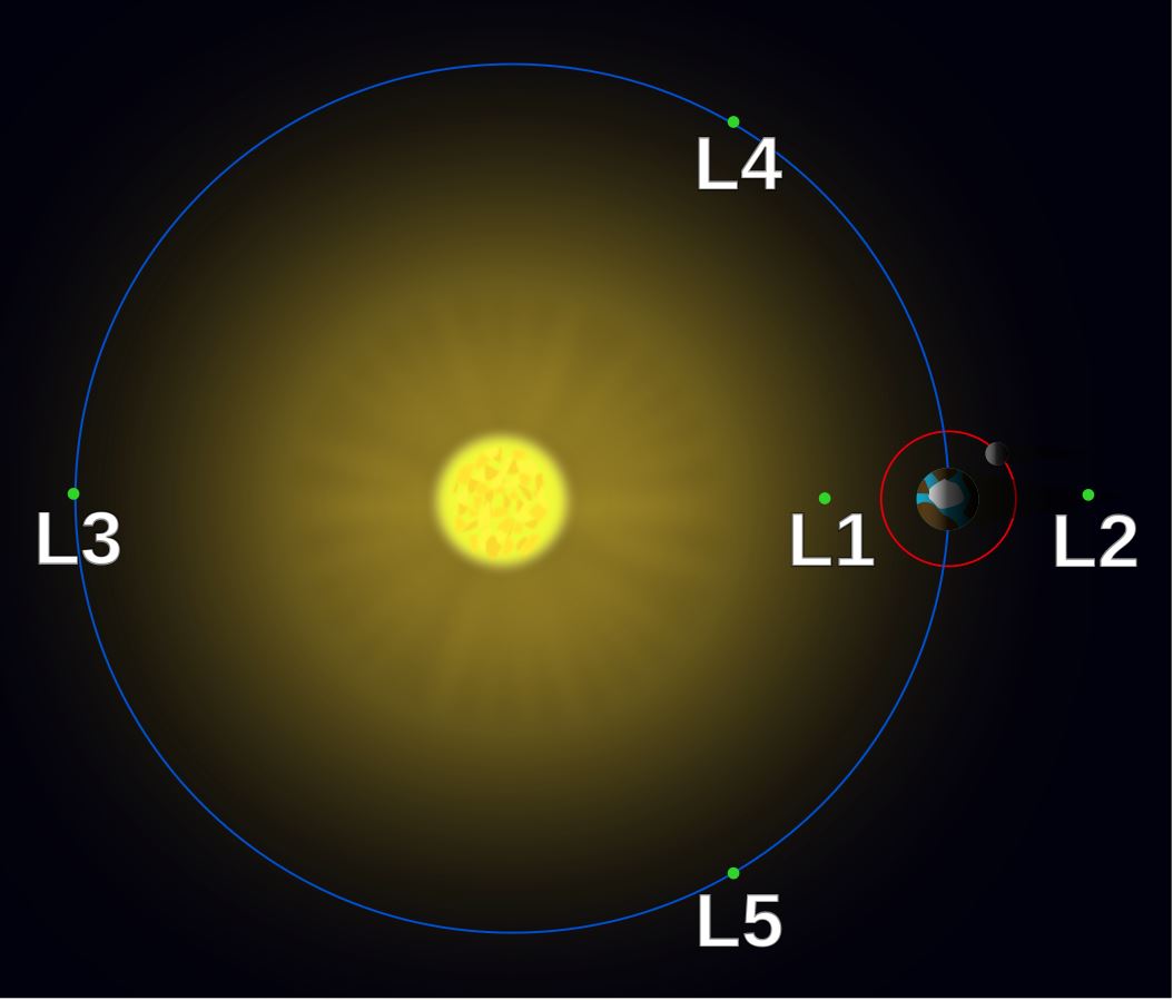 Slika 2 – 2a) animacija Lagrangeovih točaka ; 2b) položaj Lagrangeovih točaka u sustavu Sunce-Zemlja