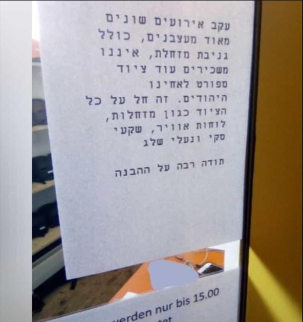 Posters in the sports shop window informed customers that, because of incidents, including theft, “we no longer rent sports equipment to our Jewish brothers”.