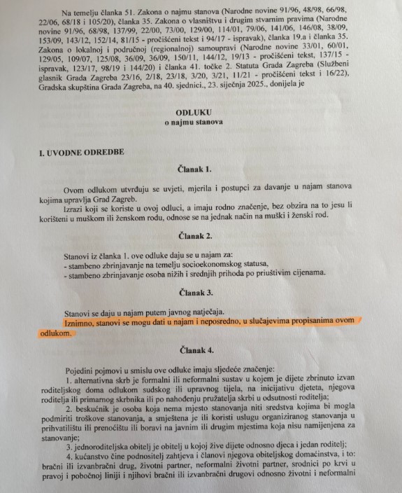 Povodom nedavnih medijskih napisa koji ukazuju da stanovnici pojedinih gradskih četvrti grada Zagreba traže hitnu reakciju policije radi izmještanja azilanata u naseljima gdje žive i to zbog sigurnosti djece i drugih opće opasnih radnji, prilažemo Odluku Gradske skupštine Grada Zagreba od 23. siječnja 2025. godine prema kojoj se gradski stanovi mogu dodjeljivati azilantima bez natječaja – mimo svih procedura i bez ikakve transparentnosti .
