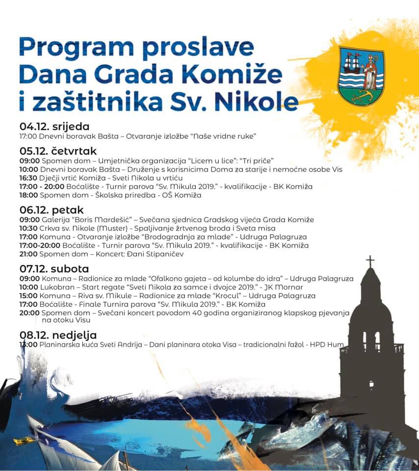 Proslava blagdana svetog Nikole i Dana grada Komiže tradicionalno se održava obrednim spaljivanjem barke u čast svetoga Nikole, zaštitnika pomoraca i putnika. Taj događaj se održava prema višestoljetnom običaju svake godine 6. prosinca. Ove godine, od 4. do 8. prosinca 2019. grad Komiža za blagdan sv. Nikole organizira višednevna kulturna događanja, kazališne predstave i koncerte.
