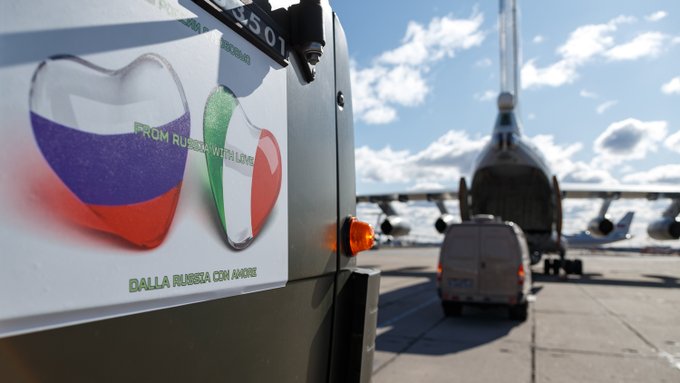 Rusija, naime, šalje svoje stručnjake i opremu za borbu protiv koronavirusa u najpogođenije dijelove Italije. Radi se o zaštitnoj opremi, kao što su medicinski uređaji i mobilni sistemi za dezinfekciju vozila i terena na osnovi sistema Kamaz, te brigadama ruskih medicinskih stručnjaka među kojima oko 100-tinjak virologa i epidemiologa. Ruske stručnjake na aerodromu dočekalo je visoko talijansko izaslanstvo. Ministar vanjskih poslova Luigi Di Maio i načelnik Glavnog stožera oružanih snaga Enzo Vecciarelli zahvalili su Ruskoj Federaciji na pruženoj pomoći.