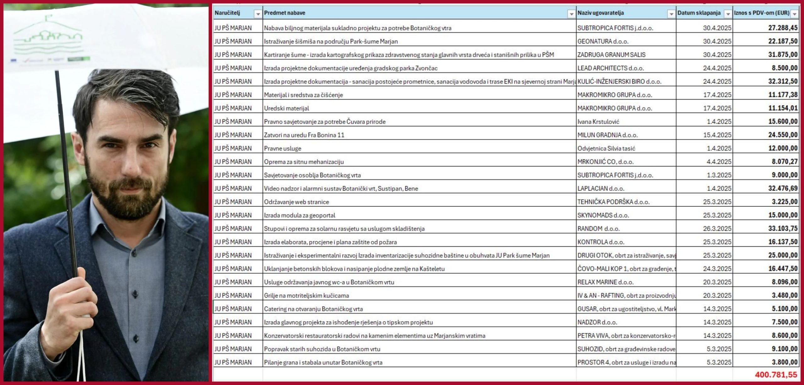 u tablici u prilogu ove objave možete vidjeti koliko je novca i na što Javna ustanova Park-šuma Marjan potrošila samo u zadnja dva mjeseca. Kako se izbori bliže, tako broj i vrijednost ugovorenih roba i usluga neprestano rastu. Ukupno je u dva mjeseca spiskano 400.000 eura ili bivših 3 milijuna kuna! Treba napomenuti da je to iznos bez plaća, režijskih i drugih tekućih troškova ustanove.
