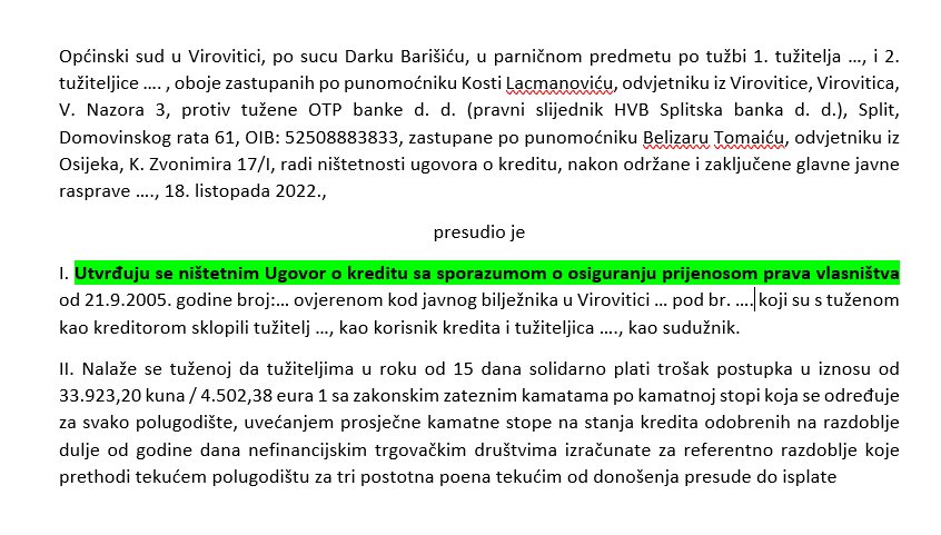 Općinski sud u Virovitici po sucu Darku Barišiću utvrdio je 18. listopada 2022. ništetnost CHF ugovora koji su dvoje potrošača zajedno ugovorili s OTP Bankom 2005. na iznos 88.000 CHF protuvrijednosti u kunama. Potrošače zastupa odvjetnik Kosta Lacmanović iz Virovitice. Izvrstan je to uvod u epilog situacije oko utvrđenja ništetnosti CHF ugovora na Vrhovnom sudu RH.