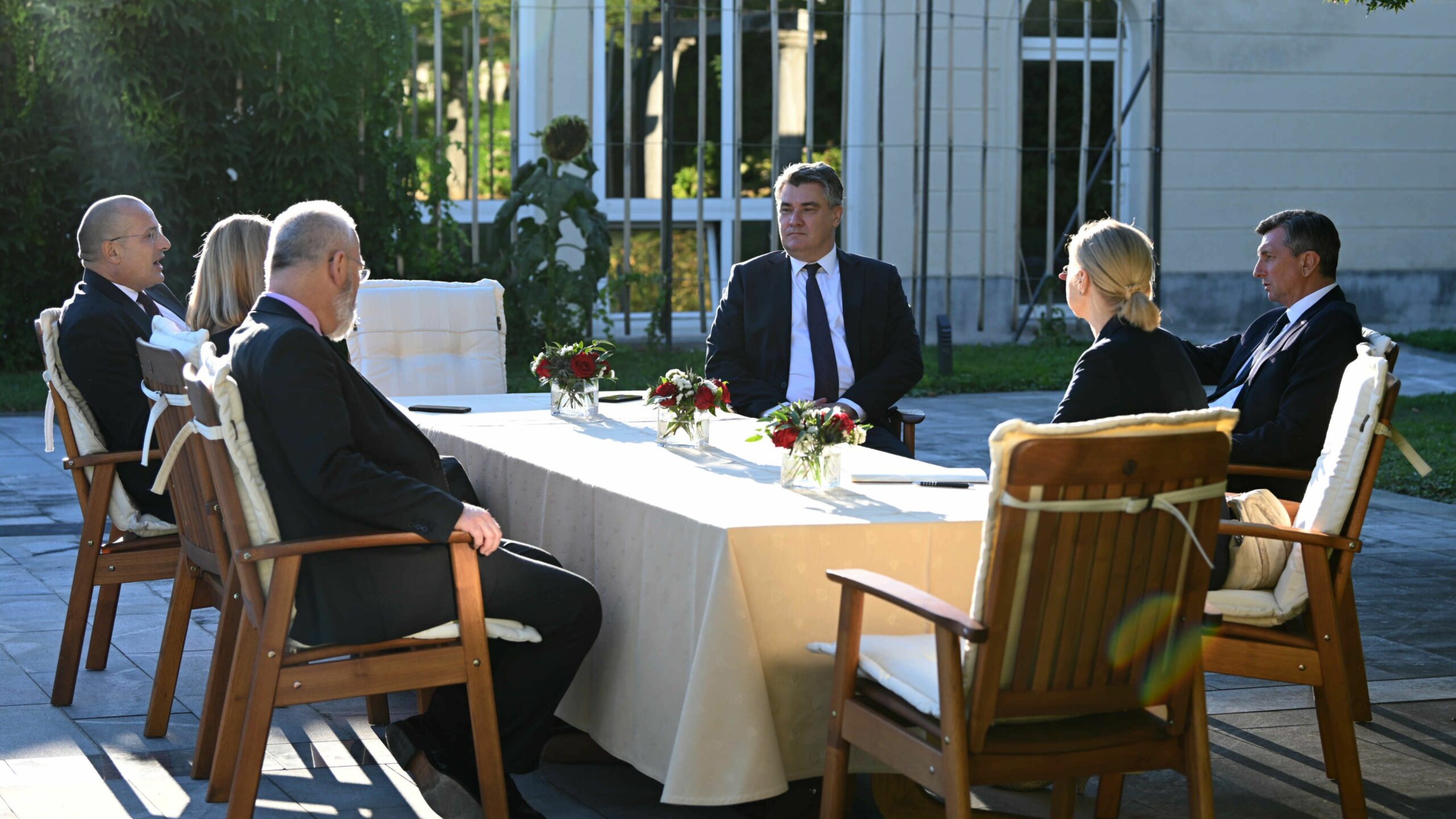 Uz predsjednika Milanovića na sastanku sa slovenskim predsjednikom Pahorom bili su predstojnik Ureda predsjednika Republike dr. sc. Orsat Miljenić i savjetnik Predsjednika za vanjsku i europsku politiku Neven Pelicarić.