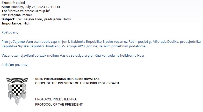 URED PREDSJENIKA RH OBAVIJESTIO JE MUP O DOLASKU PREDSJEDNIKA REPUBLIKE SRPSKE NA HVAR