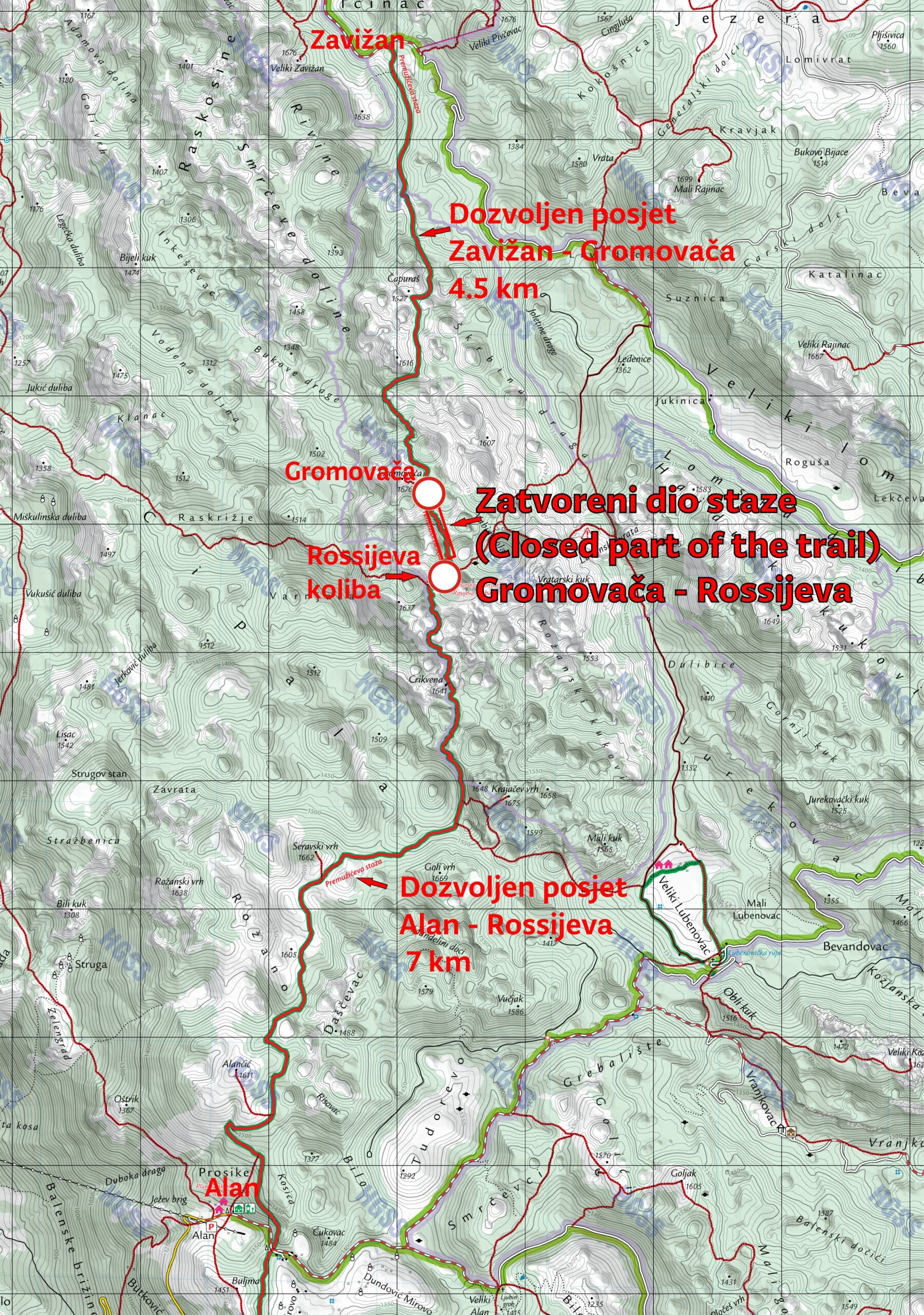 Iz navedenog razloga prolaz cijelom stazom od Zavižana do Alana nije moguć dok se iz smjera Zavižana može se doći do skretanja za Gromovaču a iz smjera Alana do Rossijeve kolibe.