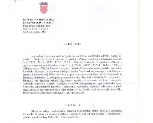 U postupku pred Upravnim sudom u Splitu po tužbi dr. sc. Ljiljane Zmijanović, kojom se preispituje zakonitost Rješenja ministra Tomislava Ćorića glede izbora ravnateljice NP Krka Nelle Slavice, odbijen je zahtjev za izuzeće sutkinje koje je podnio ministar Ćorić. Rješenje naslovnog suda od 28. veljače 2020. donosimo u prilogu teksta. Naime, nakon provedenog inspekcijskog nadzora u slučaju imenovanja Ravnateljice Javne ustanove Nacionalni park Krka Nelle Slavice, Državno inspektorat je zaključio da joj treba uručiti otkaz. Nella Slavica u trenutku izbora za ravnateljicu bila je članica dviju političkih stranaka – i HDZ-a i HNS-a. U HNS se učlanila u vrijeme Kukuriku vlade, a HDZ-ovu iskaznicu ima od 2007. godine. No, nakon što je Upravni sud poništio rješenje o njezinom izboru za ravnateljicu te ustanove, ministar zaštite okoliša Tomislav Ćorić, ne priznajući odluku Suda po drugi puta je donio rješenje o imenovanju Nelle Slavice za ravnateljicu Nacionalnog parka Krka.