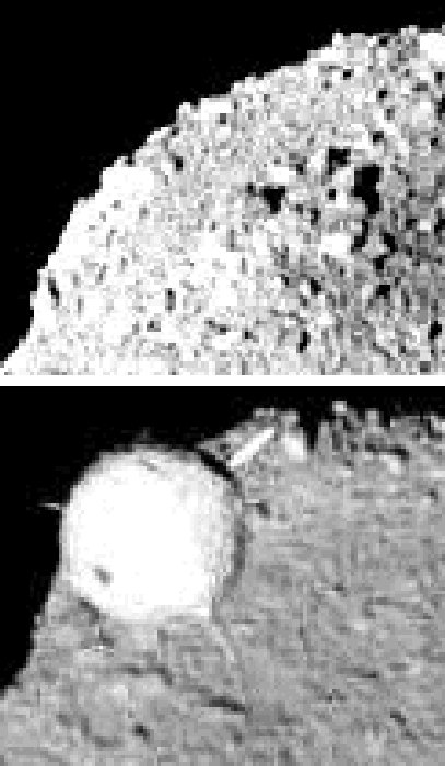 Slika 4: Gore: detalj izvornog snimka na slici 2. Dolje: detalj snimka na slici 3 na kojem je zbog pojačanja kontrasta i posvjetljivanja došlo do spajanja planova i pojačanja artefakata. Obje slike pokazuju isti dio površine.