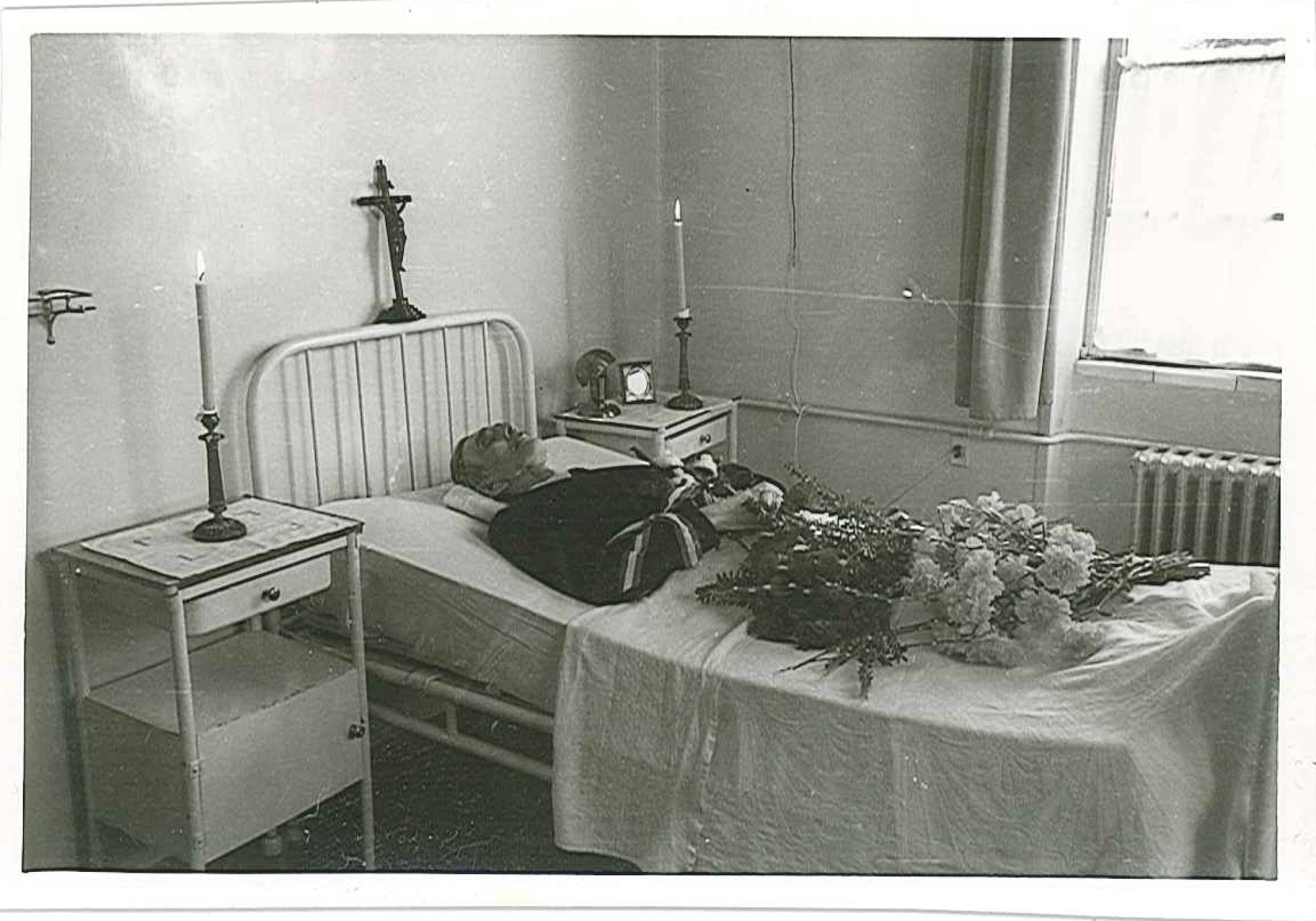 Tijelo diktatora u njemačkoj bolnici u Madridu, ležalo je u ogrtaču na krevetu s buketom cvijeća na nogama. Ukočenost smrti ocrtavala se na čeljusti, na obrazima, na nosu, a bile su tu i one zloslutne crne obrve i ogromne uši. Nad uzglavljem kreveta bilo je raspelo, a sa bočnih strana dvije tmurne svijeće sa upaljenim plamenom. Kroz prozor, s otvorenim zavjesama, ulazila je bolesna zimska svjetlost koja osvjetljava njegov leš.