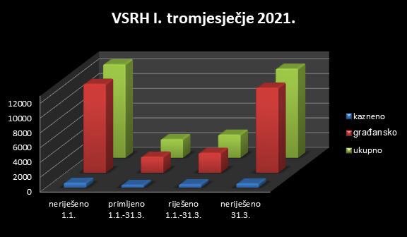 U grafičkom prikazu kojeg je objavio Vrhovni sud RH vidljivo je kako je građanski odjel toga suda riješio 2679 predmeta, što iznosu 123,68 posto u odnosu na primljene predmete, dok je ostalo 11.503 neriješenih. Kazneni odjel VSRH riješio je 454 predmeta što iznosi 123,36 posto u odnosu na primljene predmete dok je u pisarnici suda ostalo 565 neriješenih.