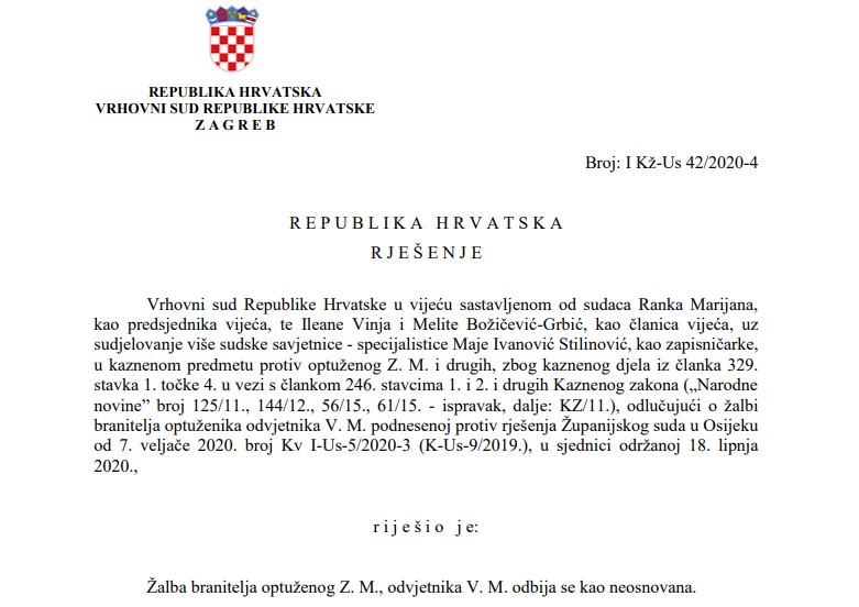 Vrhovni sud Republike Hrvatske donio je rješenje 18. lipnja 2020. a objavio ga je u srijedu, 8. srpnja 2020. na svojim službenim internetskim stranicama kao i na službenom twitter profilu, kojim je odbio kao neosnovanu žalbu odvjetnika Zdravka Mamića i potvrdio prvostupanjsko rješenje Županijskog suda u Osijeku. Time je postalo pravomoćno rješenje kojim je određeno suđenje Zdravku Mamiću u odsutnosti.