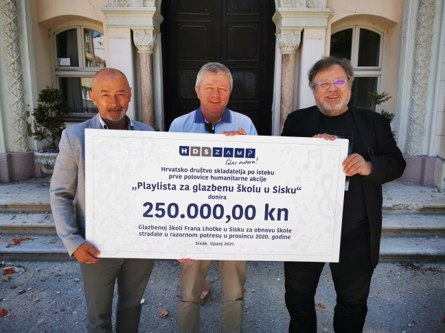 Hrvatski glazbeni autori i nositelji autorskih prava te njihova Služba ZAMP Hrvatskog društva skladatelja prikupili su u prvom dijelu humanitarne akcije „Playlista za glazbenu školu Sisak“ 250 tisuća kuna za obnovu potresom uništene Glazbene škole Frana Lhotke u Sisku i Petrinji. Iznos je uplaćen na račun škole, a predsjednik HDS-a Mladen Tarbuk i glavni direktor HDS ZAMP-a Nenad Marčec u ponedjeljak, 14. lipnja 2021., uručili su i simboličan ček ravnatelju škole Tomislavu Ivšiću.