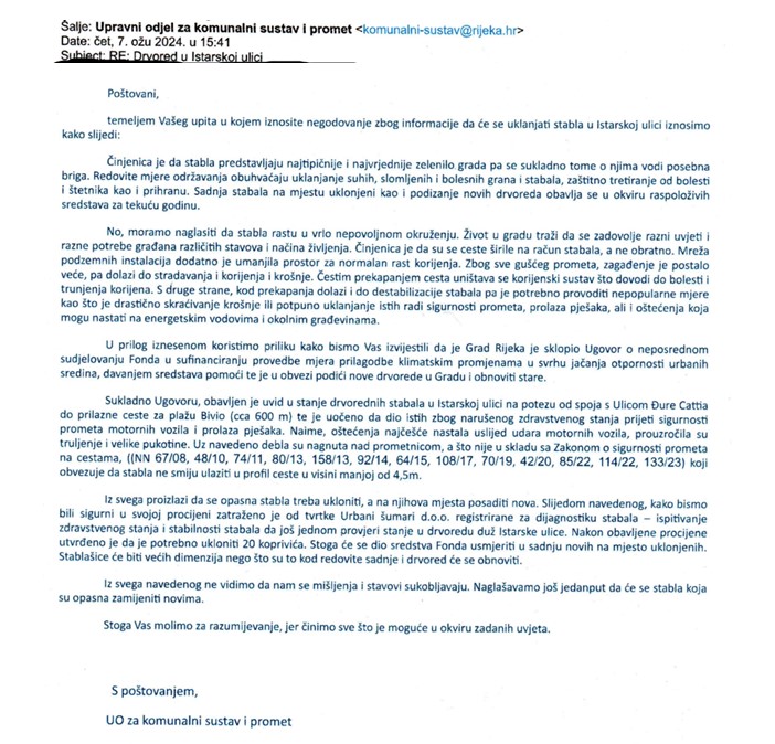 Naše sumnje potvrđuje i e-mail odgovor Upravnog odjela za komunalni sustav i promet od 7. ožujka 2024. koji je u stvari njihov odgovor zašto imaju namjeru rušiti stabla. Cijela e-mail dostavljamo kao prilog, a ovdje citiramo samo dio koji se odnosi na naše sumnje: