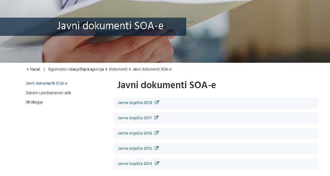 Iako su sva dosadašnja izvješća Sigurnosno-obavještajne agencije Republike Hrvatske dostupna javnosti još od 2014. godine, slučajno ili ne, SOA na svojim službenim internetskim stranicama izvješće za 2019. godinu nije objavila u rubrici “javni dokumenti SOA-e”.